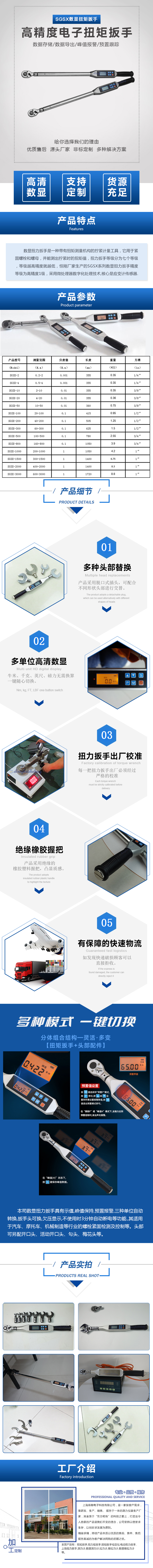 扭力扳手是一種帶有扭矩測(cè)量機(jī)構(gòu)的擰緊計(jì)量工具,它用于緊固螺栓和螺母,并能測(cè)出擰緊時(shí)的扭矩值,扭力扳手等級(jí)分為七個(gè)等級(jí),等級(jí)越高精度就越低,鑄衡廠家生產(chǎn)的SGSX系列數(shù)顯扭力扳手精度等級(jí)為高精度1級(jí),采用微處理器數(shù)字化處理技術(shù),核心是應(yīng)變計(jì)傳感器.該數(shù)顯扳手高精度求值,性能穩(wěn)定,耗電量小,使用方便,本司1-10N.M數(shù)顯扭力扳手具有示值,峰值保持,預(yù)置報(bào)警,三種單位自動(dòng)轉(zhuǎn)換,扳手頭可換,欠壓顯示,不使用時(shí)3分鐘自動(dòng)斷電等功能.,其適用于汽車(chē)、摩托車(chē)、機(jī)械制造等行業(yè)的螺栓緊固檢測(cè)及控制等。頭部可另配開(kāi)口頭、活動(dòng)開(kāi)口頭、勾頭、梅花頭、管鉗頭,外六角套筒、內(nèi)六角套筒、套筒加長(zhǎng)桿、特殊定制頭部等。